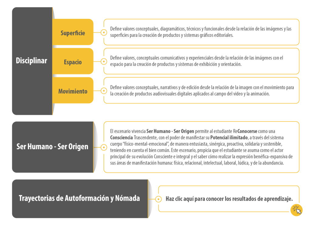 Estas son las Vivencias Académicas (asignaturas) que hacen parte de tu recorrido de 4 años en COLEGIATURA, donde aprendes a crear conexiones visuales con sentido y a transformar mensajes en experiencias. Lo primero será ReConocerte como un Ser Humano con Potencial ilimitado, capaz de observar, cuestionar y proponer desde tu manera única de ver el mundo. A partir de ahí, construyes tu Perfil Profesional a través de asignaturas que fortalecen tu capacidad de análisis, creación y comunicación visual, luego desarrollas tu PerfilConsciente desde tu sensibilidad gráfica y pensamiento crítico, para habitar los entornos desde la imagen y el diseño.